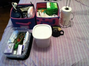 For ‘lady items’ I have a Mooncup and cotton reusuable pads, which has reduced the amount of lady items that I need. So in the shower I have the soap and hair stuff that I currently use; toothbrushes and toothpaste by the sink, a tall thin cupboard with lady items, loo roll, extra toothpaste (I do like to have spares of those things!) and some spray for cleaning.