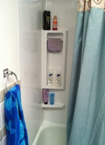 Shower stuff — his & hers body washes (to be replaced with a single bar of soap upon their demise), shampoo and conditioner, face wash, shaving cream.