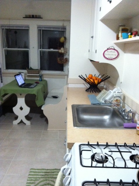Stove – clean.  Sink – clean. Counters – clean. Satellite bowl full of oranges – awesome. Breakfast nook – lovely, and clean! Sign stating, “It’s official – I’ve become my mother” – hilarious, and true.