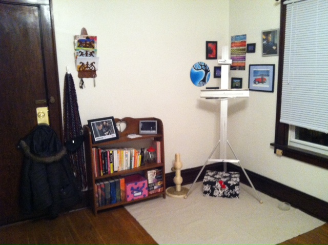 This is the corner by my door, featuring a bookshelf – those are all the books I own, a far cry from my initial library — and easel.  The pretty box on the floor holds some records for painting projects.  The wall has various photos and another record painting.