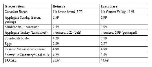 • Thick-sliced bacon (my favorite) – Earth Fare’s house brand is $21.99 for a 3lb package. An 18-ounce package of Garrett Valley at Heinen’s was $10.99. Point, Earth Fare.
