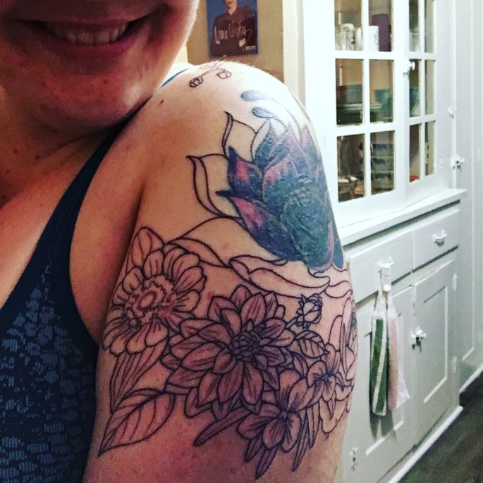 I finally got over it and designed the most beautiful piece of art I have ever had placed on my person (so far). It’s a beautiful complement to my lotus, building on the existing tattoo and then circling around it in an array of different flowers.