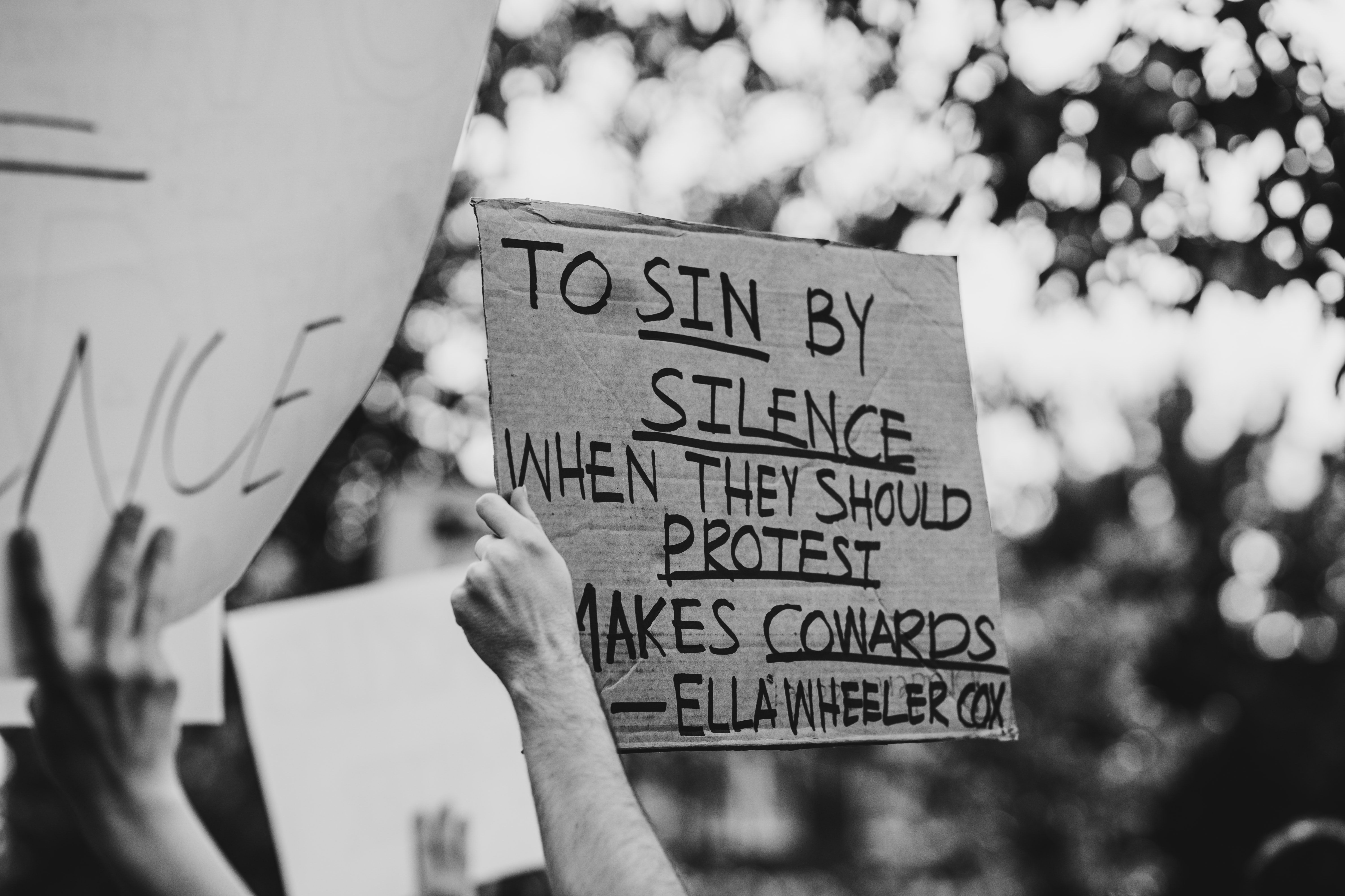 Image Desc: A photo from a Black Lives Matter protest with signs unfocused in the foreground and background. A sign in the center, held up by a white-appearing person’s arm, says “To sin by silence when they should protest makes cowards – Ella Wheeler Cox”